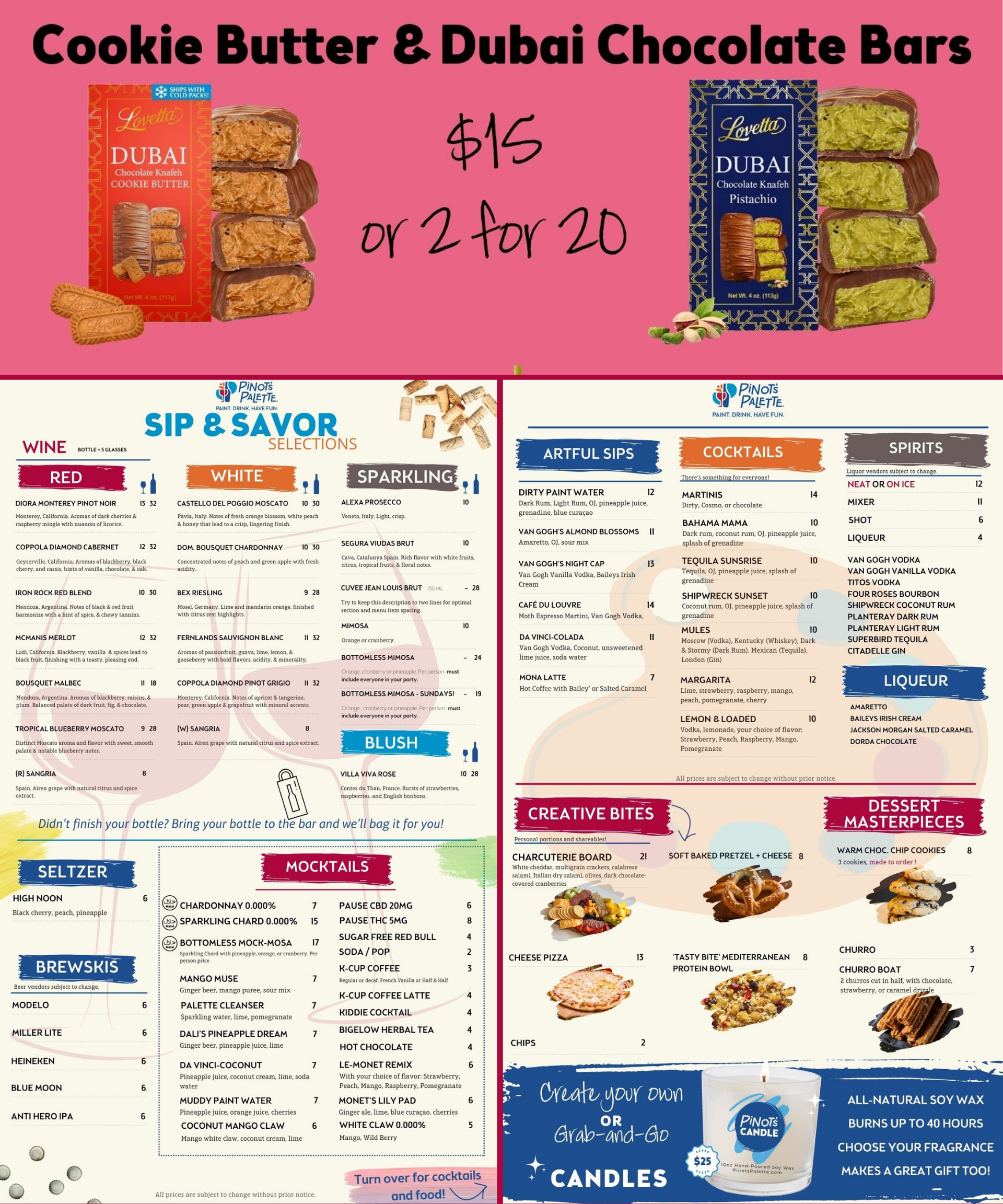 Uncork a bottle of wine and pour your ART out! We have a bar where you may purchase soft drinks, beer, wine, and cocktails.* 21+ Must show valid ID for alcoholic beverages
