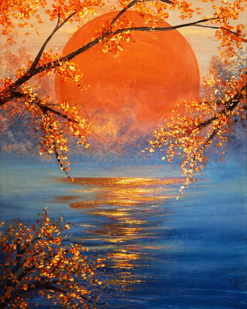 A glowing sunset melts into shimmering water as delicate blossoms catch the light.