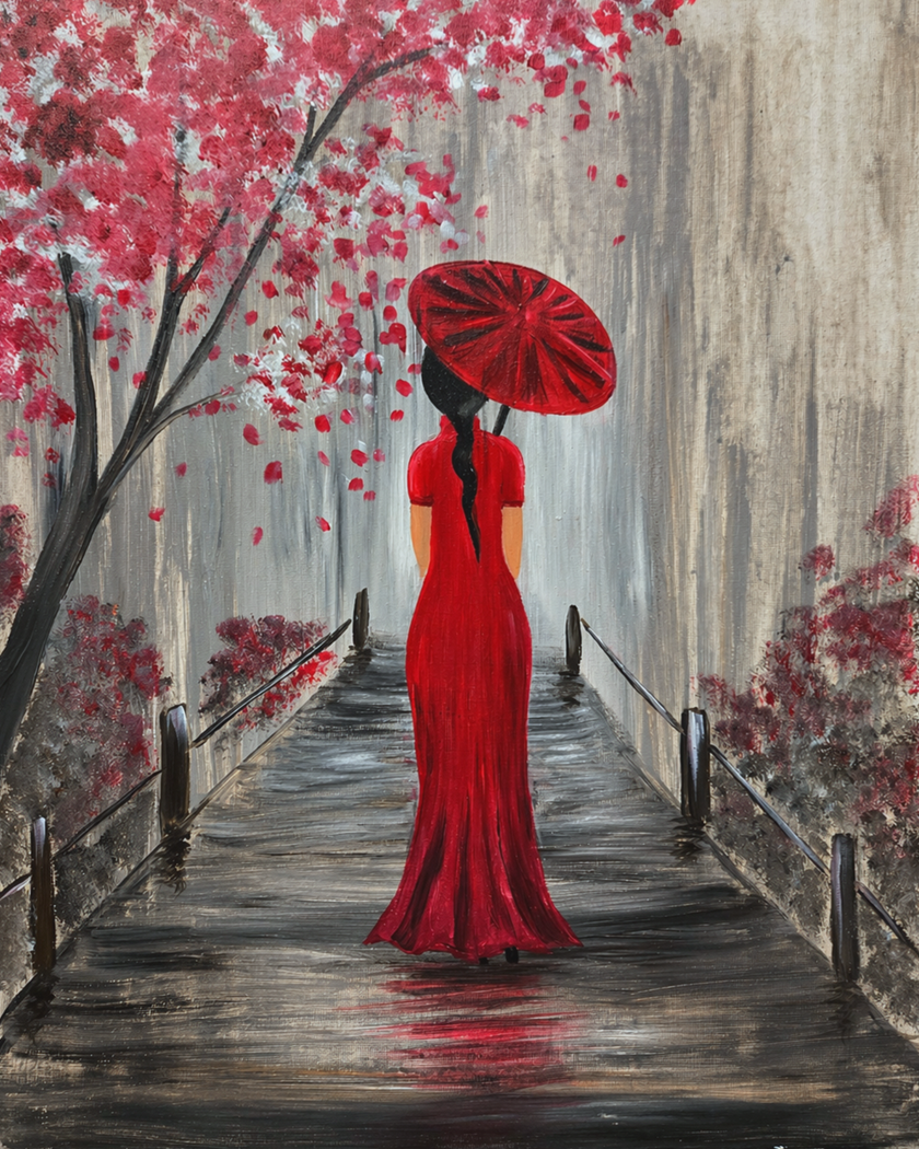 A quiet walk in crimson beneath drifting petals and soft falling rain.