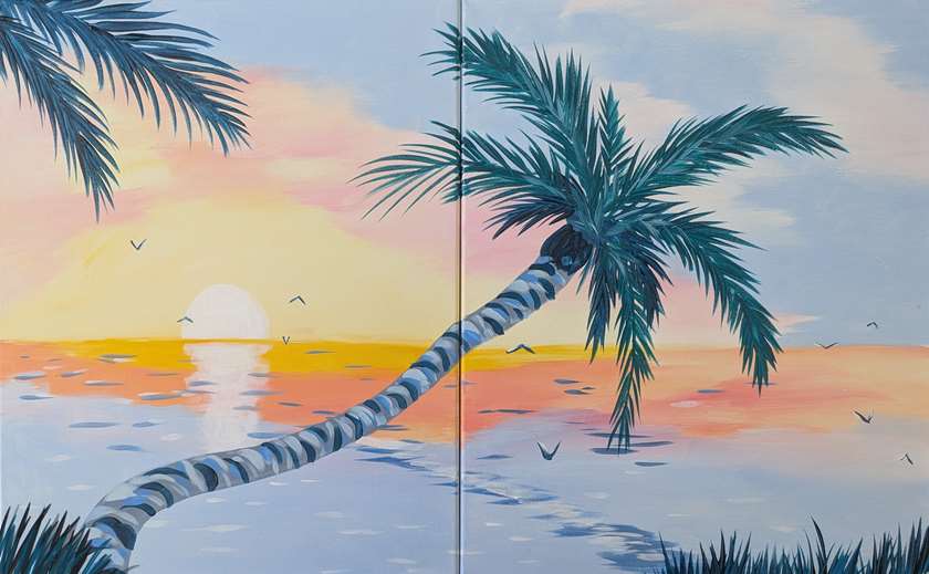 Escape to the coast and paint a serene sunrise over calm waters and swaying palms.