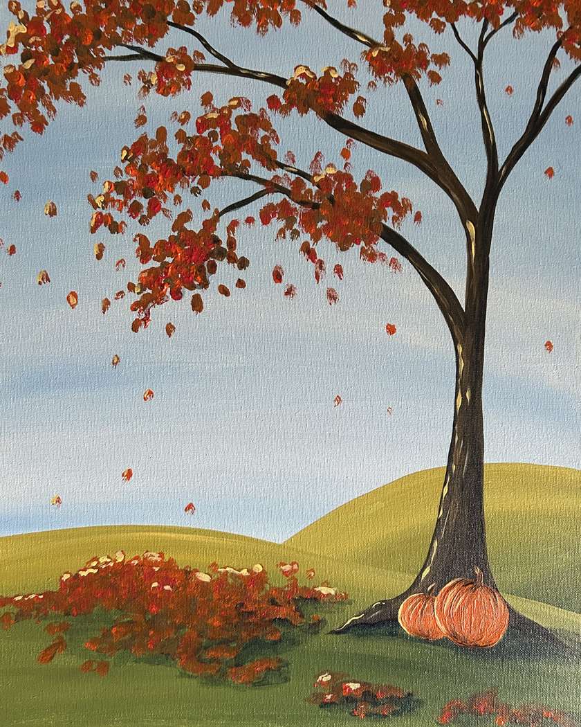 Celebrate the season with this cozy fall scene! You’ll paint a glowing autumn tree with colorful leaves drifting in the breeze, set against rolling hills and topped off with two cheerful pumpkins at the base. Simple step-by-step instruction makes this painting beginner-friendly and fun, while the warm fall colors bring plenty of seasonal charm.