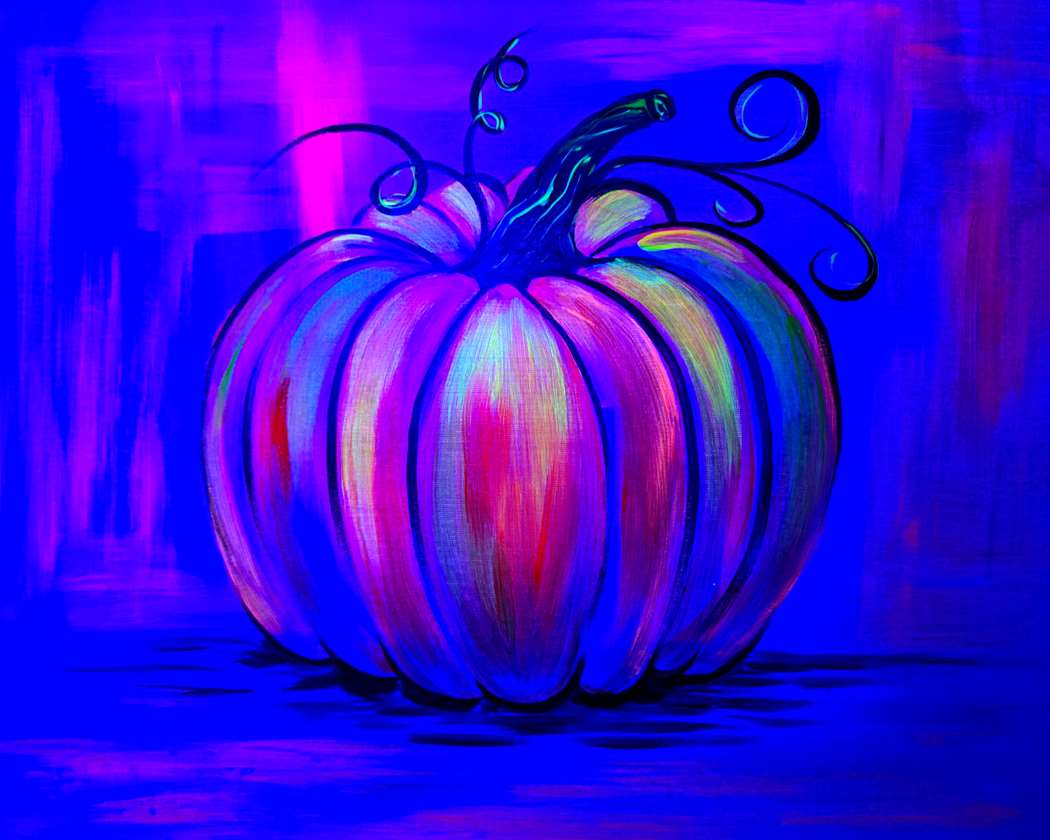 A glowing pumpkin painted in bold fluorescent colors, perfect for blacklight fun this season!