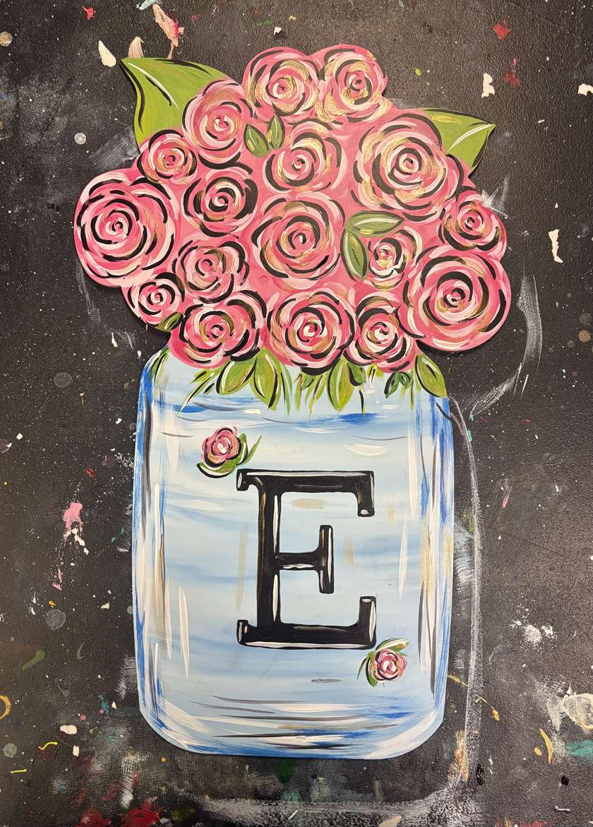 Create a charming, personalized floral masterpiece in this fun and relaxed Paint & Sip session! This design features a rustic mason jar painted in soft blue tones, beautifully accented with a bold monogram letter of your choice. Bursting from the jar is a lush bouquet of whimsical pink roses, highlighted with playful brushstrokes and touches of gold for added flair. Set against a textured, artsy background, this piece combines elegance with a touch of farmhouse charm.