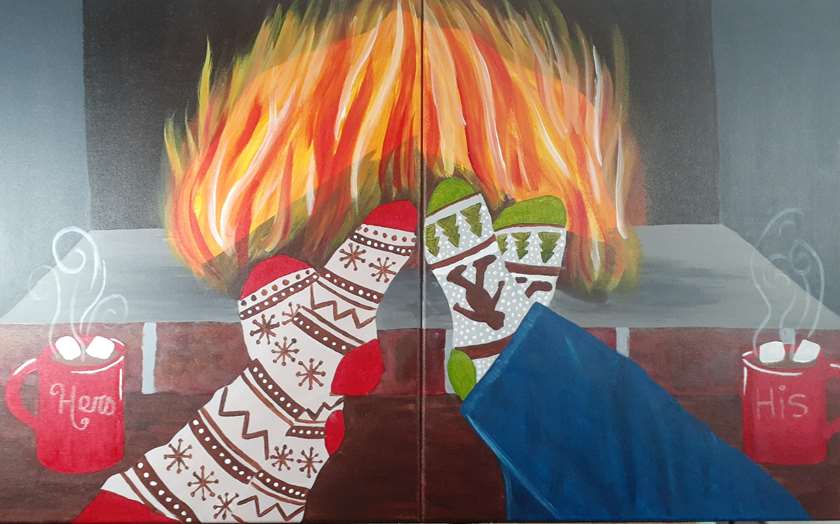 Snuggle up for this festive date night painting! With mugs of cocoa, patterned holiday socks, and a glowing fire, this scene is the ultimate cozy winter vibe. Painted across two canvases, you and your partner will each create half of the picture that comes together as one heartwarming masterpiece. A perfect way to sip, paint, and get into the holiday spirit!