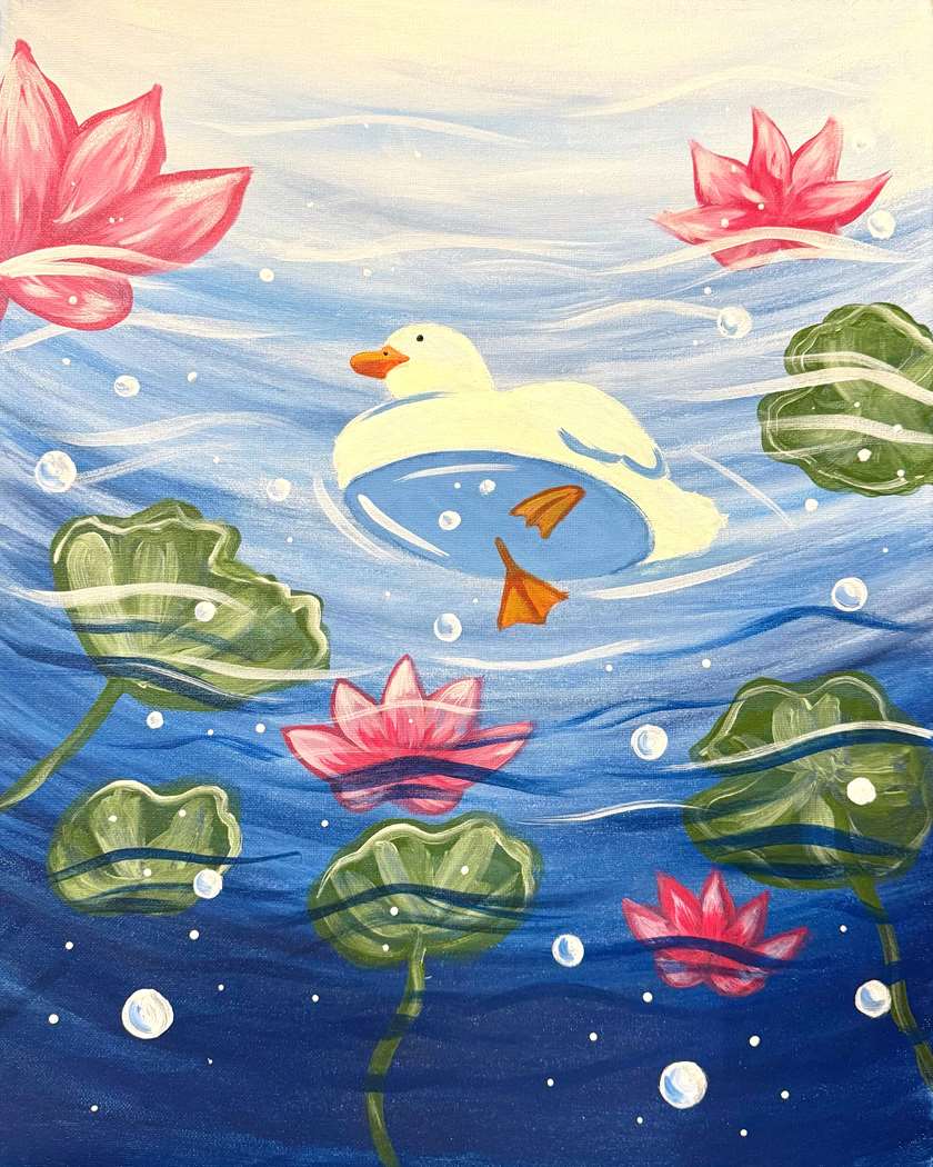 "Duck From Down Under" is colorful painting showing a swimming duck from below. This Piece has everything you need for a nice summer day. Not only is there a cute duck, but there are also flowers, lily pads, and bubbles!