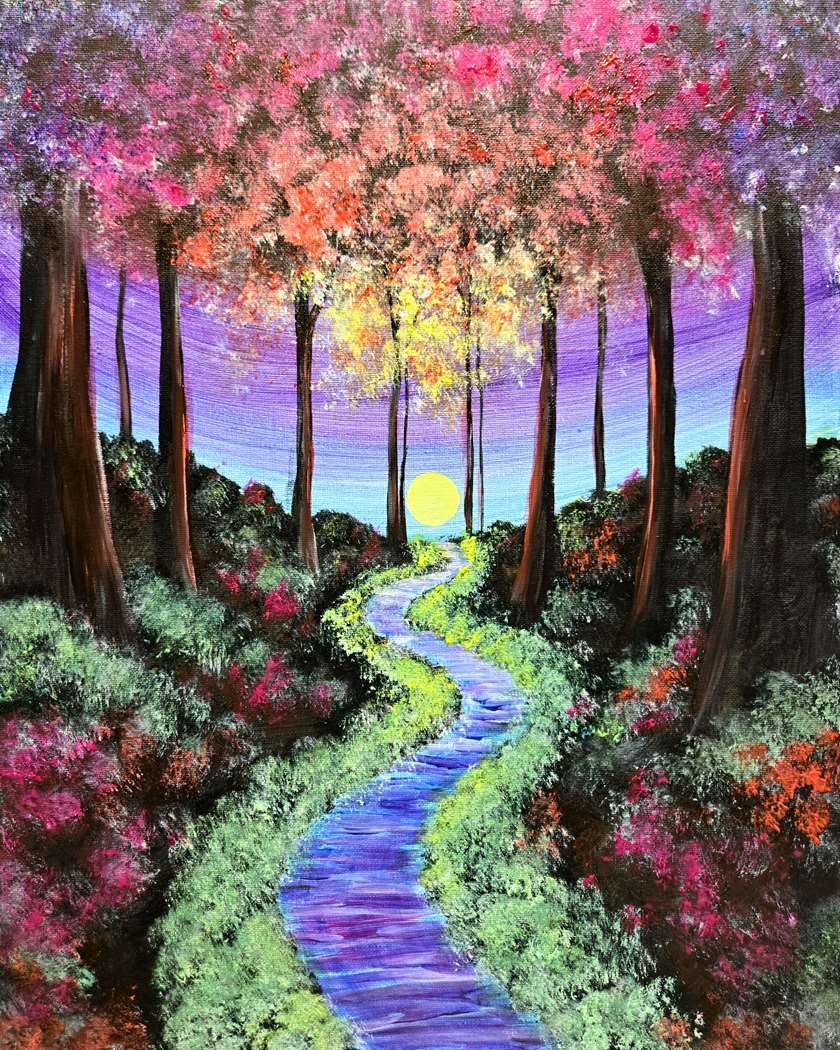 A glowing forest path shifts from soft twilight tones into vibrant blacklight color, inviting painters to follow the trail into an enchanted night filled with creativity, glow, and a little bit of magic!