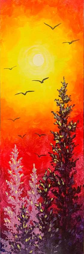 Tall pines under the warm autumn sun with a flock flying south overhead. Come relax and have a drink while you create this simple work of art just in time for fall.