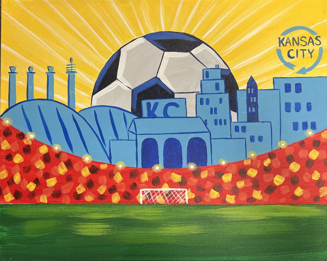Celebrate the phenomenon that is the World Cup coming to the Kansas City area with this bright and colorful painting. With a soccer ball shining bright as the sun behind the KC skyline, it's glow showers over the city and arrowhead where the teams will play.