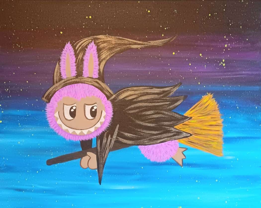 Take flight under the starry night sky with this adorable fuzzy Lafufu dressed as a witch! Perched on a broomstick, this cutie is ready to bring some Halloween magic your way. Bright colors and playful details make this a fun and beginner-friendly painting that’s perfect for spooky season.