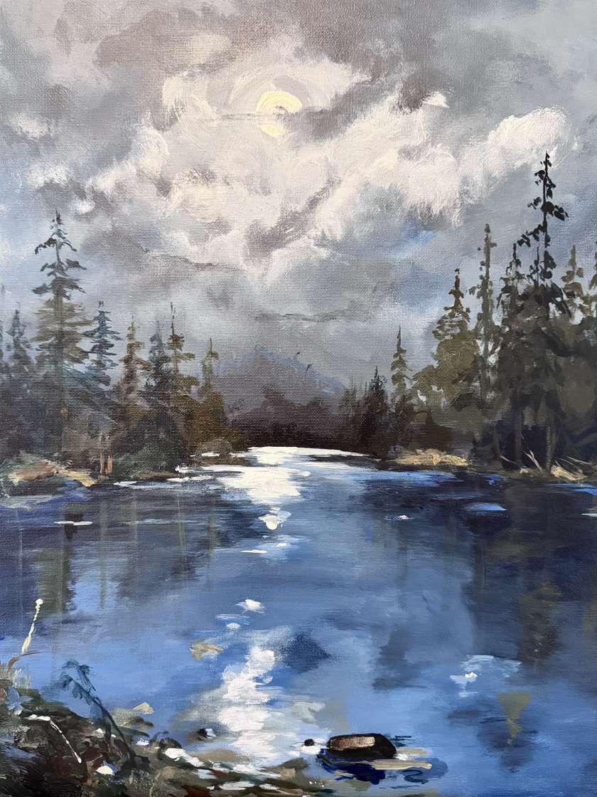 A quiet, moonlit landscape unfolds as soft clouds drift across a glowing sky, casting gentle light over a calm body of water below. Reflections ripple across the surface, mirroring the surrounding evergreens and creating a serene, atmospheric moment that feels both peaceful and introspective. Painted in cool blues and muted earth tones, this work captures the stillness of nature at twilight and invites the viewer into a place of calm and reflection.