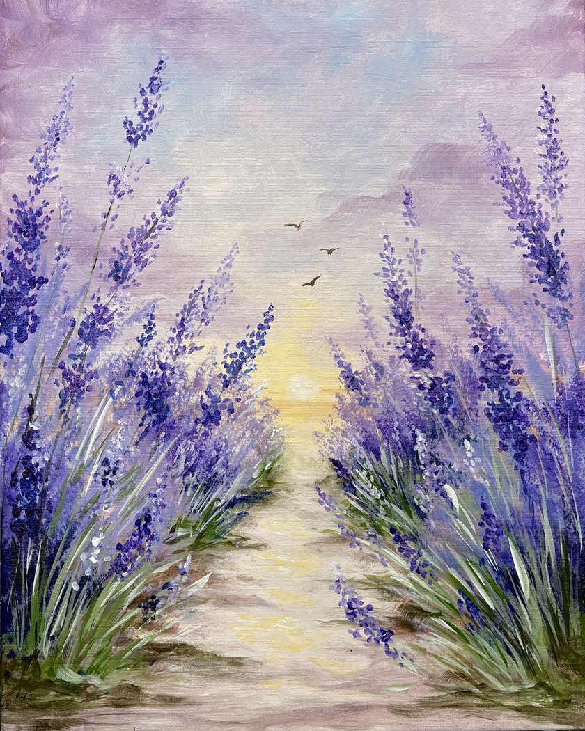 Paint a peaceful lavender path at sunset, with soft purples, gentle greens, and a warm glowing sky. Tall lavender blooms frame the trail, and a few birds drift above, creating a calm and relaxing scene for all skill levels.
