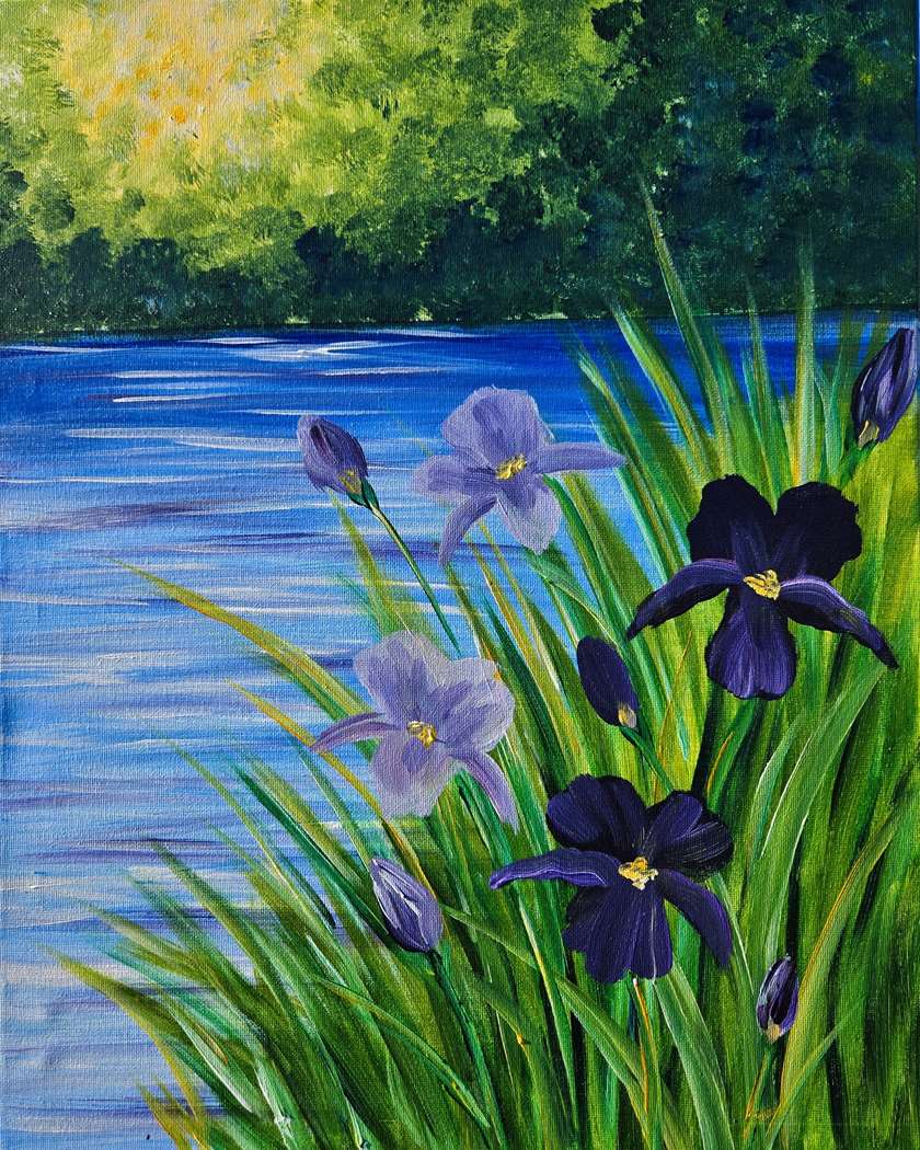 Inspired by Monet’s garden scenes, this piece captures soft light, gentle water reflections, and blooming irises in a relaxed, impressionist style.
