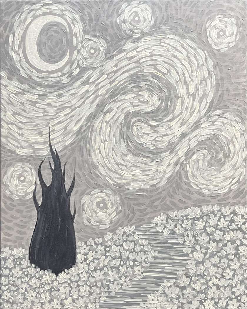 Relax and let your brush wander as you create this dreamy, Van Gogh–inspired night sky. With gentle swirls, soft clouds, and fields of glowing flowers, Van Gogh’s Cloudy Dreams is a peaceful painting that’s fun, forgiving, and perfect for everybody!