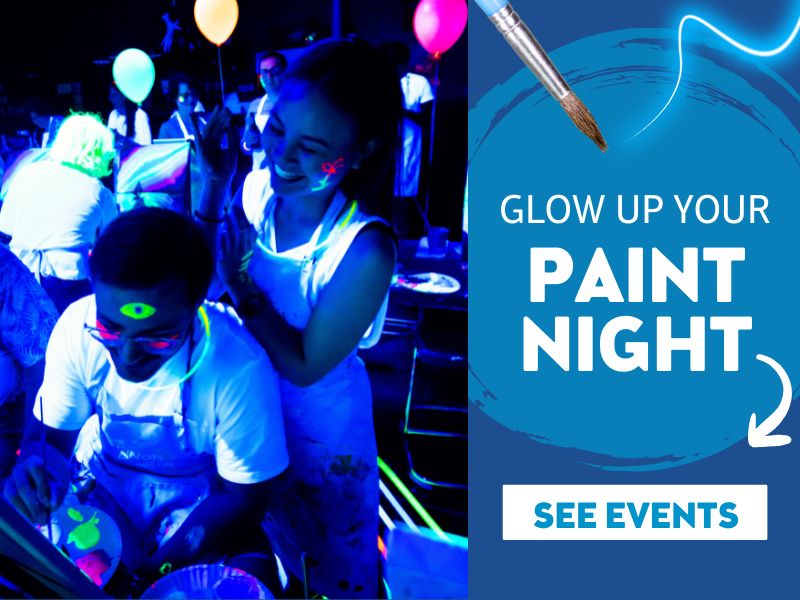 If you're looking for a completely different paint-and-sip experience, we've got you covered! Our blacklight classes and private parties are unlike anything you've ever done before. When the lights go out, the fluorescent paint glows and your inhibitions disappear! Take the vibes into overdrive with your favorite beverage from our full-service bar. It's perfect for date night, girl's night, family night or a solo painting experience. You have to try it!!