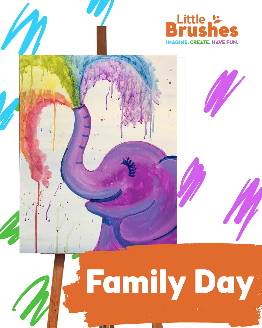 Splish splash! It's time for a bath! This happy pachyderm is ready for a rainbow full of ele-FUN!